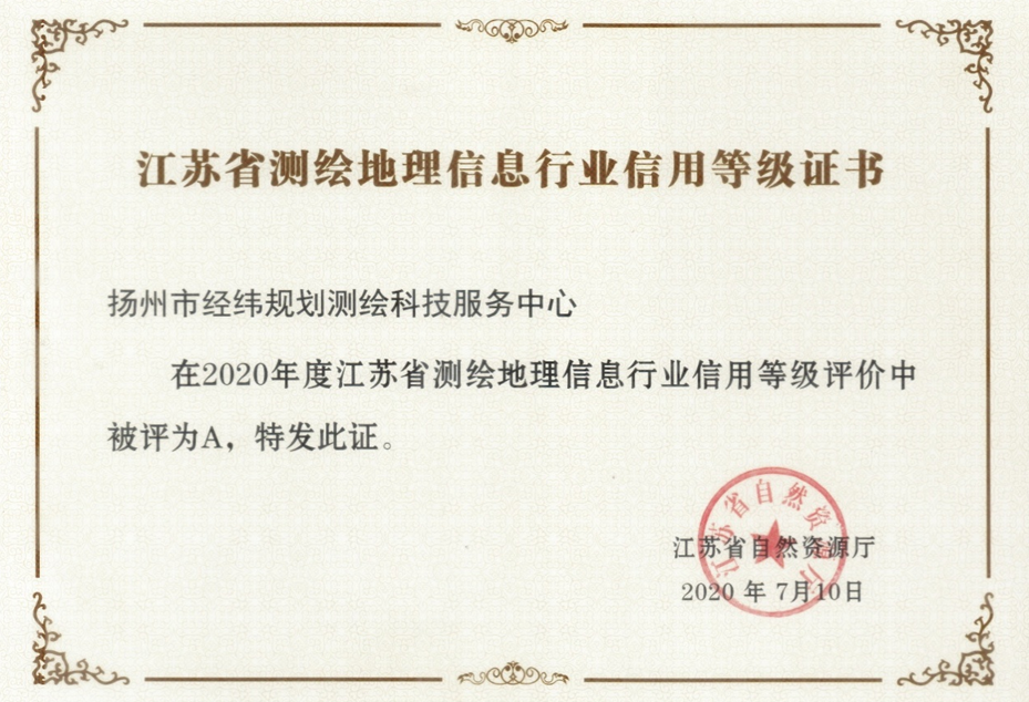 經(jīng)緯測繪中心榮獲2020年度江蘇省測繪地理信息行業(yè)A級信用