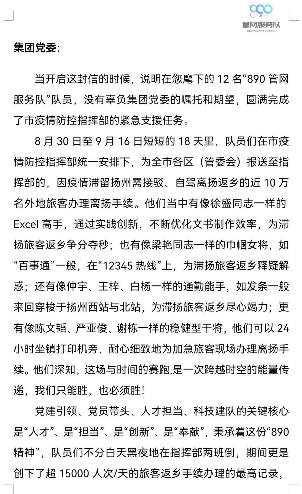 志愿服務(wù)工作結(jié)束后,這12名敬業(yè)而又可愛的志愿者將18天來工作的點點滴滴匯聚成了一封匯報信,向集團(tuán)黨委匯報他們不辱使命,用實際行動踐行了“守城衛(wèi)家、城控有我”的鏗鏘誓言,并請集團(tuán)黨委放心,他們將把抗疫精神繼續(xù)延續(xù)到今后的工作中,讓890管網(wǎng)服務(wù)隊成為民生服務(wù)的金字招牌。