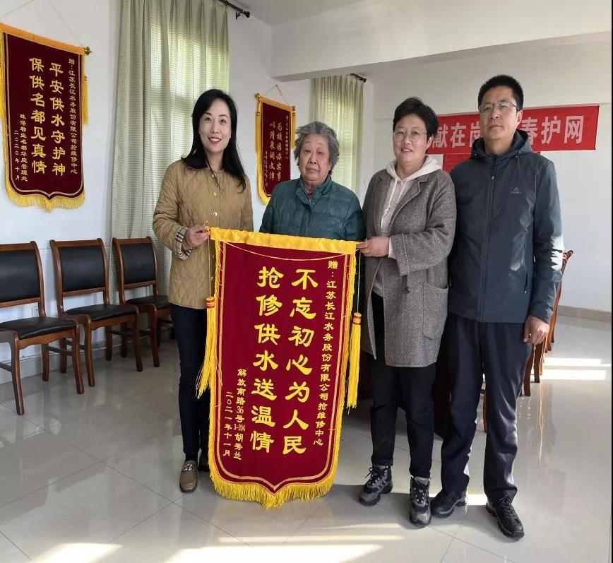 11月10日下午,社區李主任帶著胡奶奶來到長江水務搶維修中心辦公樓,據李主任介紹:胡奶奶家人患有重病,經濟較困難,一直在治療中,才從醫院回來沒幾天,就遇上這樣大的事,無疑給她家中雪上加霜,這一次多虧長江水務水網先鋒幫了大忙,然后把胡奶奶寫好的感謝信還有寫有“不忘初心為人民,搶修供水送溫情”的錦旗贈送給部門負責人,并表示這次來重點是感謝長江水務水網先鋒解決胡奶奶的大困難,及時化解社情矛盾,熱心幫助胡奶奶家度過難關。