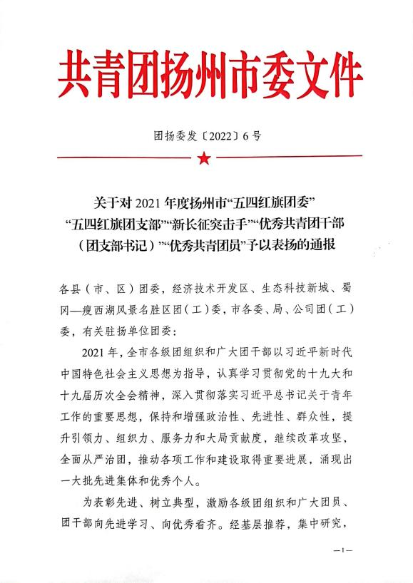 2022年是中國共青團成立100周年。近日,揚州團市委印發了《關于對2021年度揚州市“五四紅旗團委”“五四紅旗團支部”“新長征突擊手”“優秀共青團干部(團支部書記)”“優秀共青團員”予以表揚的通報》(揚團委發〔2022〕6號),城控集團團委被授予2021年度揚州市“五四紅旗團委”稱號。