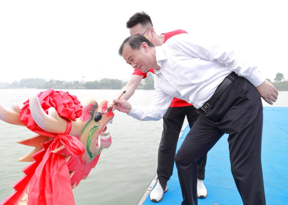 龍舟賽活動現場,葉善祥為每艘賽船龍頭進行了點睛后,宣布龍舟賽正式開賽。哨聲響、鼓點起,3支龍舟隊在水面同時競發,選手們各司其職,精神抖擻,整齊劃一的揮動手中的船槳破浪前行。親友團在岸邊搖旗吶喊、歡呼鼓掌,湖面浪花飛濺,十分壯觀。經過訓練賽、250米競速賽,最終三只龍舟都齊心協力抵達終點,角逐出了一二三名,集團領導為獲獎的各支隊伍頒獎。