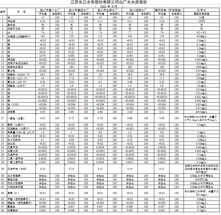 江蘇長(zhǎng)江水務(wù)股份有限公司出廠水水質(zhì)報(bào)告 ( 2022 年 07月 )