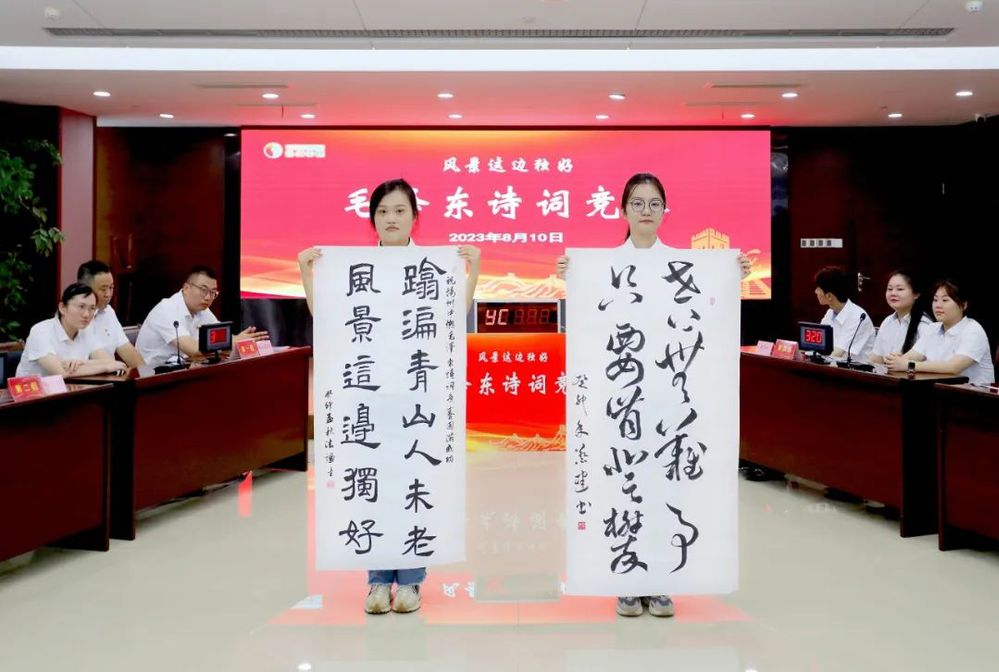 本次活動還穿插了毛澤東詩詞書法作品展示。來自公司的兩位揚州市書法家協會會員,用行草、隸書體分別書寫了“世上無難事,只要肯登攀”、“踏遍青山人未老,風景這邊獨好”。創作者將毛澤東詩詞融入書法作品,形象、生動、直觀地展現了毛澤東同志不畏困難的壯志豪情和革命樂觀主義精神。