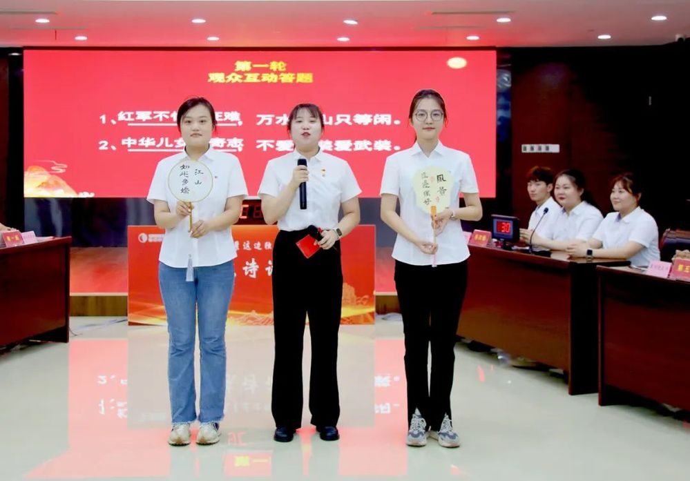 風險題“飛花令”環節將競賽推向高潮。“一橋飛架南北,天塹變通途”“赤橙黃綠青藍紫,誰持彩練當空舞?”“裝點此關山,今朝更好看”……各支代表隊你來我往,輪番背誦含有“數字”、“顏色”、“山”的毛澤東詩詞,選手們進行了一場文化素養與詩詞積累的較量,精彩的接龍不時贏得觀眾的陣陣喝彩。經過近兩個小時的激烈角逐,最終第一黨支部代表隊榮獲一等獎、第三黨支部代表隊獲得二等獎、第二黨支部代表隊獲得三等獎。