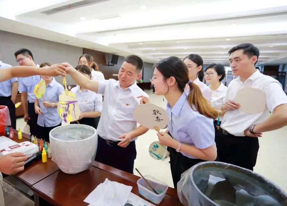以漆為筆,以水為墨。揚州中燃公司現(xiàn)場邀請所有參加人員,動手體驗非遺漆扇的魅力。大家在挑選了心儀的顏色后,在老師的指導下,將稀釋好的色漆小心翼翼地滴灑在水面上進行設(shè)計制作,將白色扇面緩緩浸入水中,或旋轉(zhuǎn)、或搖擺,一把把意蘊悠長的漆扇給大家?guī)砹瞬簧俚捏@喜。
