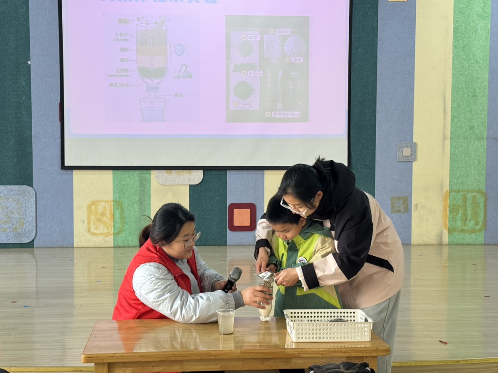 隨后的凈水實(shí)驗(yàn)將活動推向高潮。吳隊(duì)長與老師協(xié)作,準(zhǔn)備渾濁水樣、紗布、活性炭、燒杯等器材,分步演示過濾、吸附、凈化全過程。孩子們圍在實(shí)驗(yàn)臺旁,睜著好奇的眼睛觀察水質(zhì)變化,不時(shí)發(fā)出驚嘆。志愿者耐心解答孩子疑問,讓他們直觀明白凈水原理,深刻體會水資源珍貴。此次課堂以“趣味科普+實(shí)操體驗(yàn)”為特色,把節(jié)水護(hù)水種子播進(jìn)孩子心里,為節(jié)水理念傳承筑牢根基。