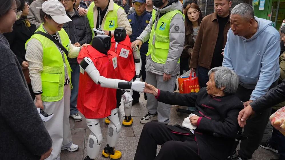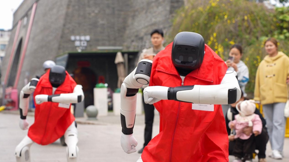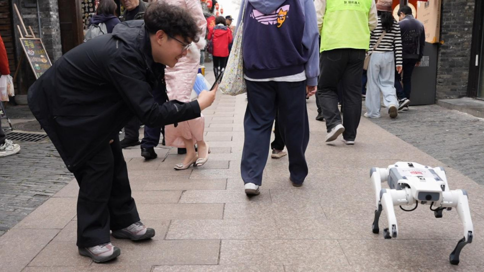 除了趣味表演,兩款機器人還承擔著智能引導職責。機器狗模擬動態(tài)巡邏姿態(tài),人形機器人則緩緩行走其間,為游客提供全方位的貼心服務。二者相輔相成,既讓游客感受到科技帶來的便捷與樂趣,也讓非遺文化、古街底蘊通過智能互動,更生動、更高效地傳遞給每一位游客。