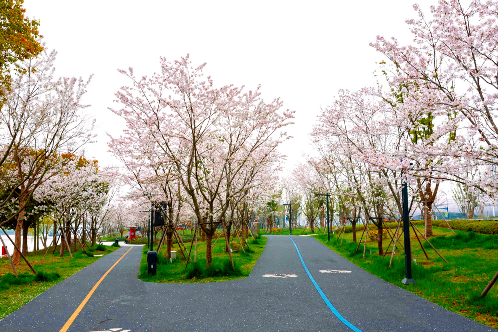 示范段內(nèi)櫻種豐富、色彩繽紛。染井吉野櫻粉白相間,盛放時如云似霞;河津櫻艷粉點綴,萼筒泛著紫紅,靈動別致;高枝早櫻潔白素雅,花枝高懸,似雪覆梢頭。繁花綴岸、高低錯落,為運河繪就了一幅溫柔爛漫的春日畫卷。